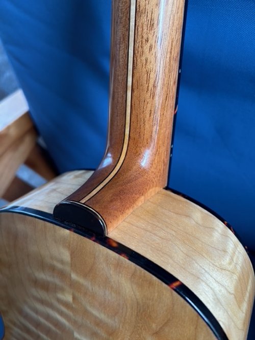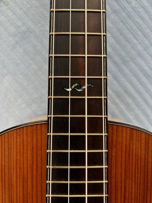 This baritone has a 20 inch scale, 1 7/16 inch nut (36.5 mm) and 14 frets clear of the body. The back and sides are quilted western maple with a locally salvaged redwood top. The laminated Spanish cedar neck is joined to the body using a stright mortise then glued and bolted in place. The bolt is recessed and covered by a decorative wooden “rosebud” held in place by a magnet. The headstock is asymmetrically slotted with a paua abalone gecko inlay, and has Rubner brass tuners with ebony buttons. The body, fingerboard and headstock are bound with faux tortoise shell binding bound fingerboard, bridge, and HS overlay are macassar ebony. The bridge is a “through bridge” design which is cosmetically cleaner and provides structural and tonal advantages. This Uke has a double action truss rod. This instrument is slightly used with some light dings on the top accounted for a discounted price.