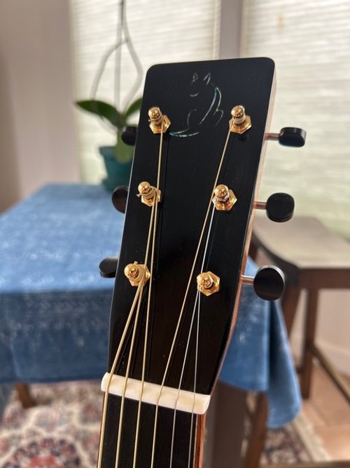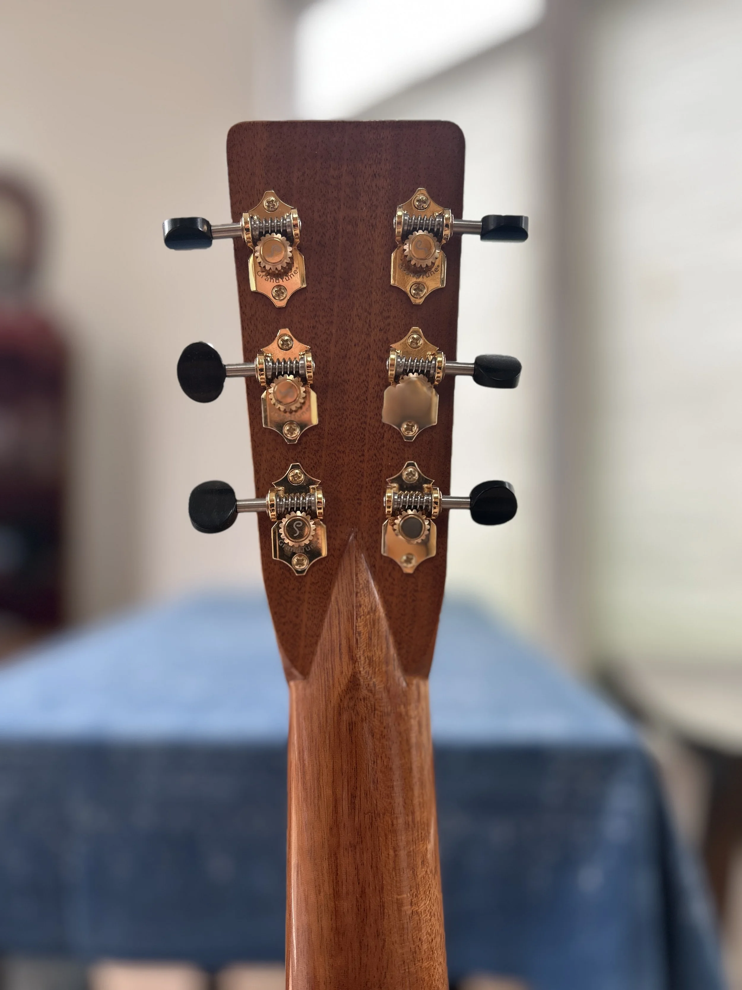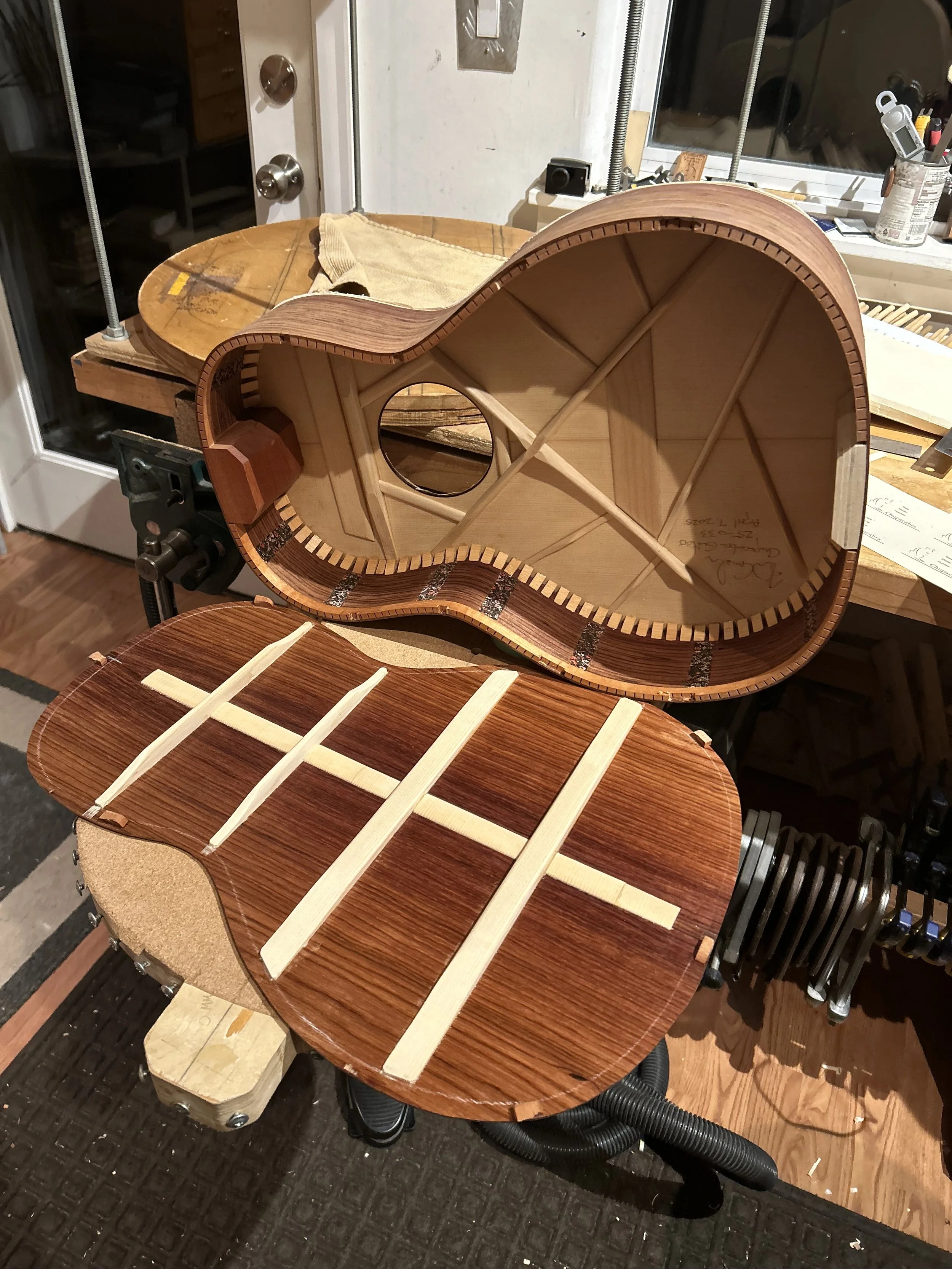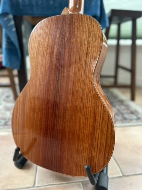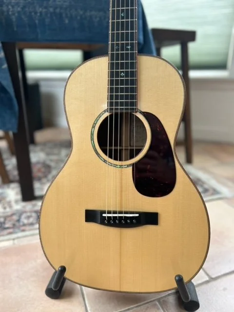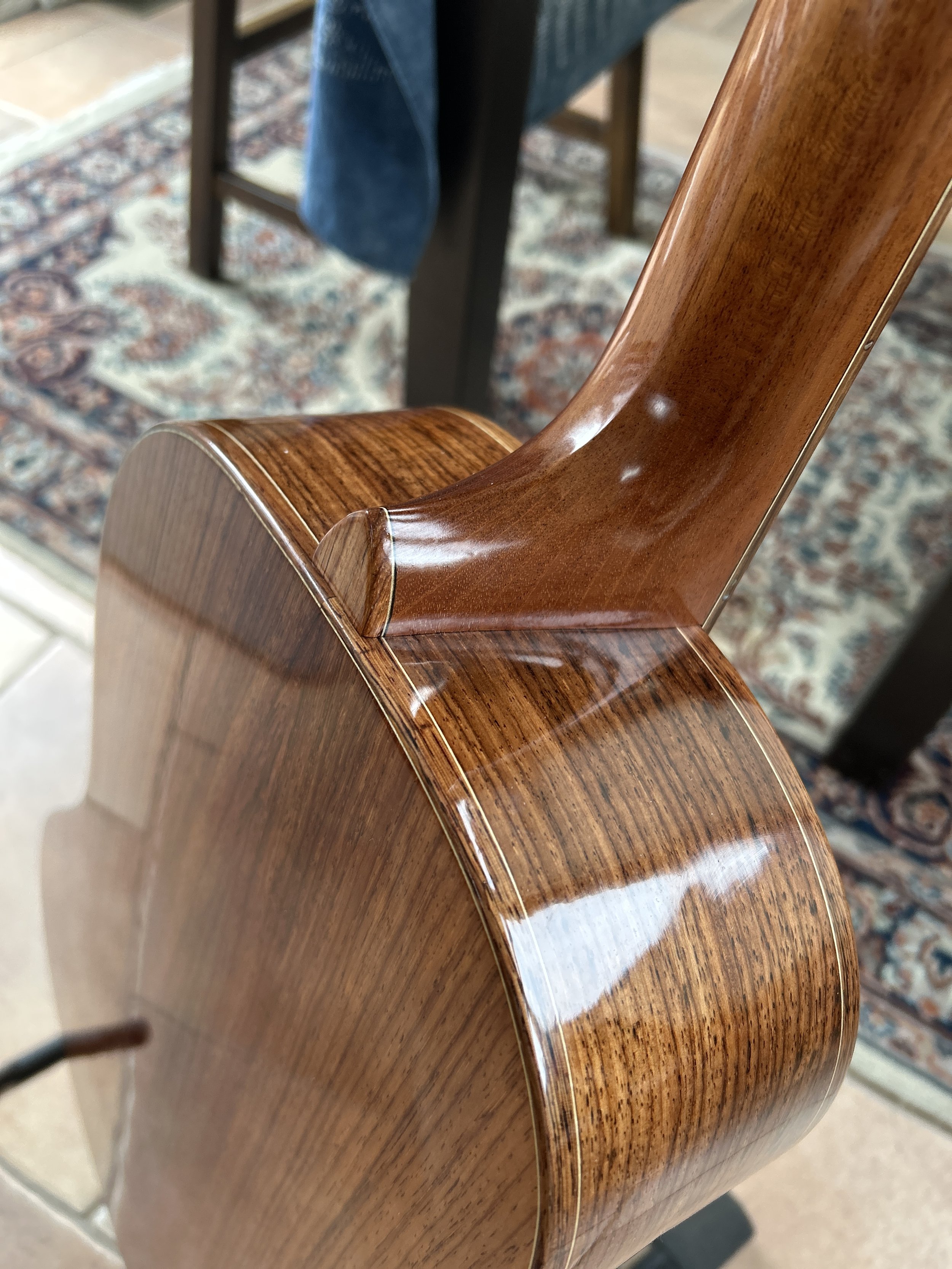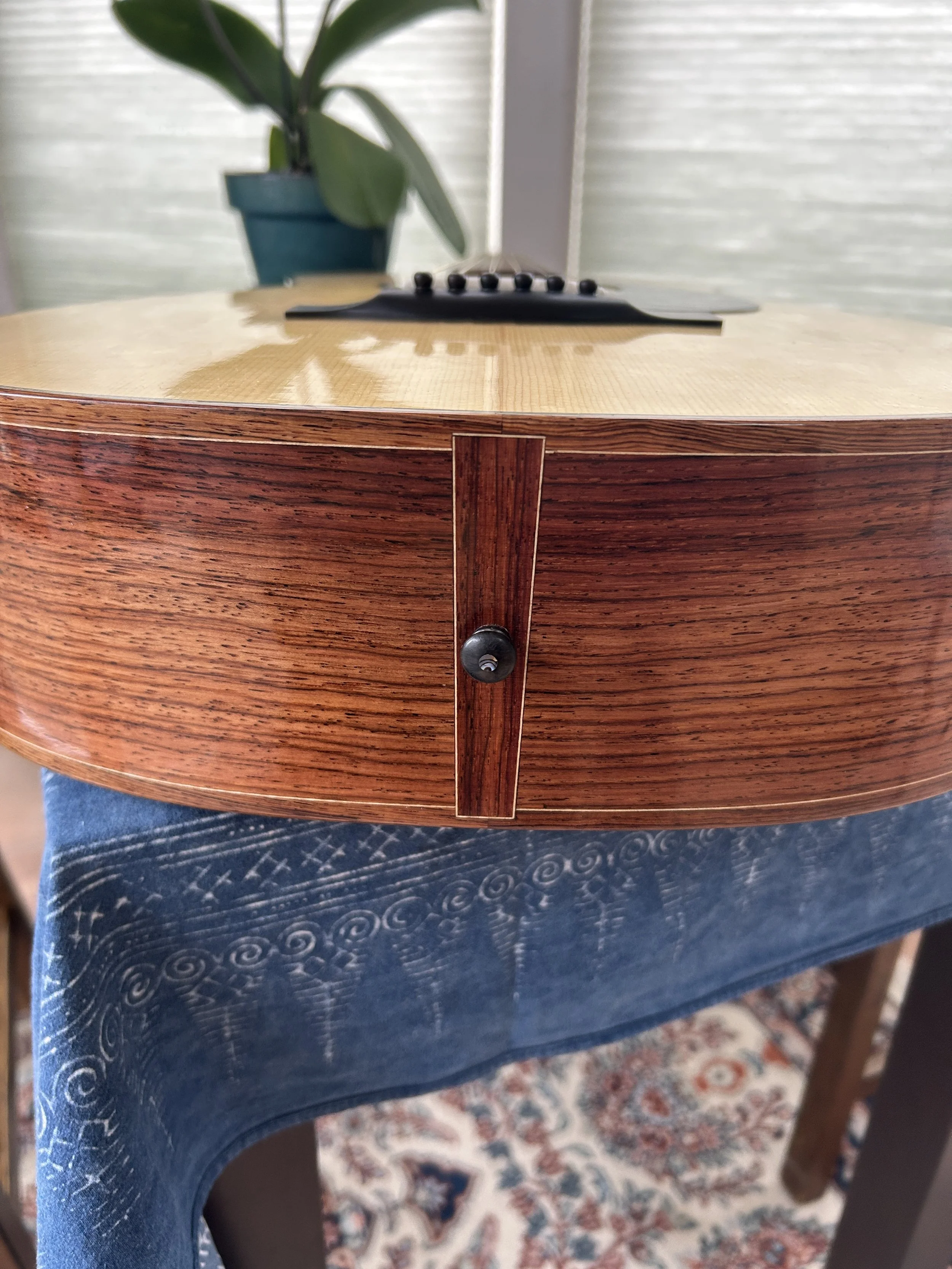 This instrument is a modern take on a traditional pre-war Martin 00-12 fret (“concert”) steel string guitar, with 12 frets clear of the body, a 25.4 inch scale and 1 3/4 inch nut. The top is Englemann spruce with back and sides of Guatamalan rosewood (D. tucarensis). The neck is figured Mahagony, with Gaboon ebony fingerboard, bridge and headstock overlay. The binding on the body and fingerboard are Cocobolo rosewood with a maple perfling strip. The scalloped bracing and linings are salvaged Port Orford Cedar, and the bridge plate is flatsawn hard maple. The top is joined to the rim using individual tentalones. Hot hide glue (HHG) was used through out. n all acoustically. Tuners are open back Schaller Grand Tunes with ebony buttons. Double action truss rod is accessed thru the sound hole. The finish is an epoxy fill, with brushed varnish and padded shellac as the top coat.