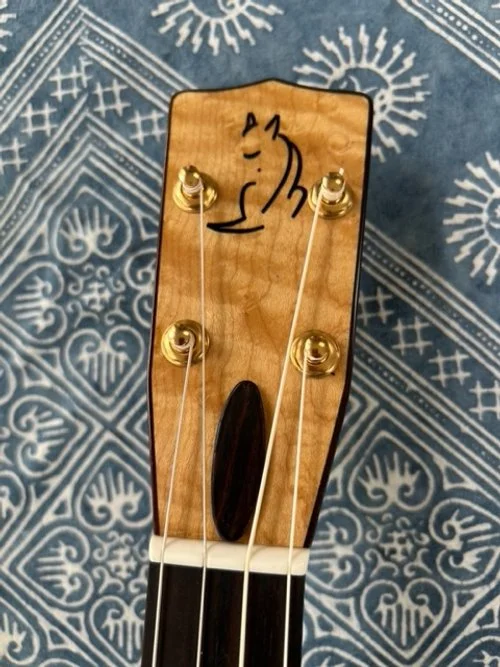 This baritone has a 20 inch scale, 1 7/16 inch nut (36.5 mm) and 14 frets clear of the body. The back and sides are figured hard maple with a salvaged old growth redwood top. The laminated Spanish cedar neck is joined to the body using a stright mortise then glued and bolted in place. The bolt is recessed and covered by a decorative wooden “rosebud” held in place by a magnet. This ukulele has a traditionally styled headstock with a “through bridge” that is definitely not traditional.