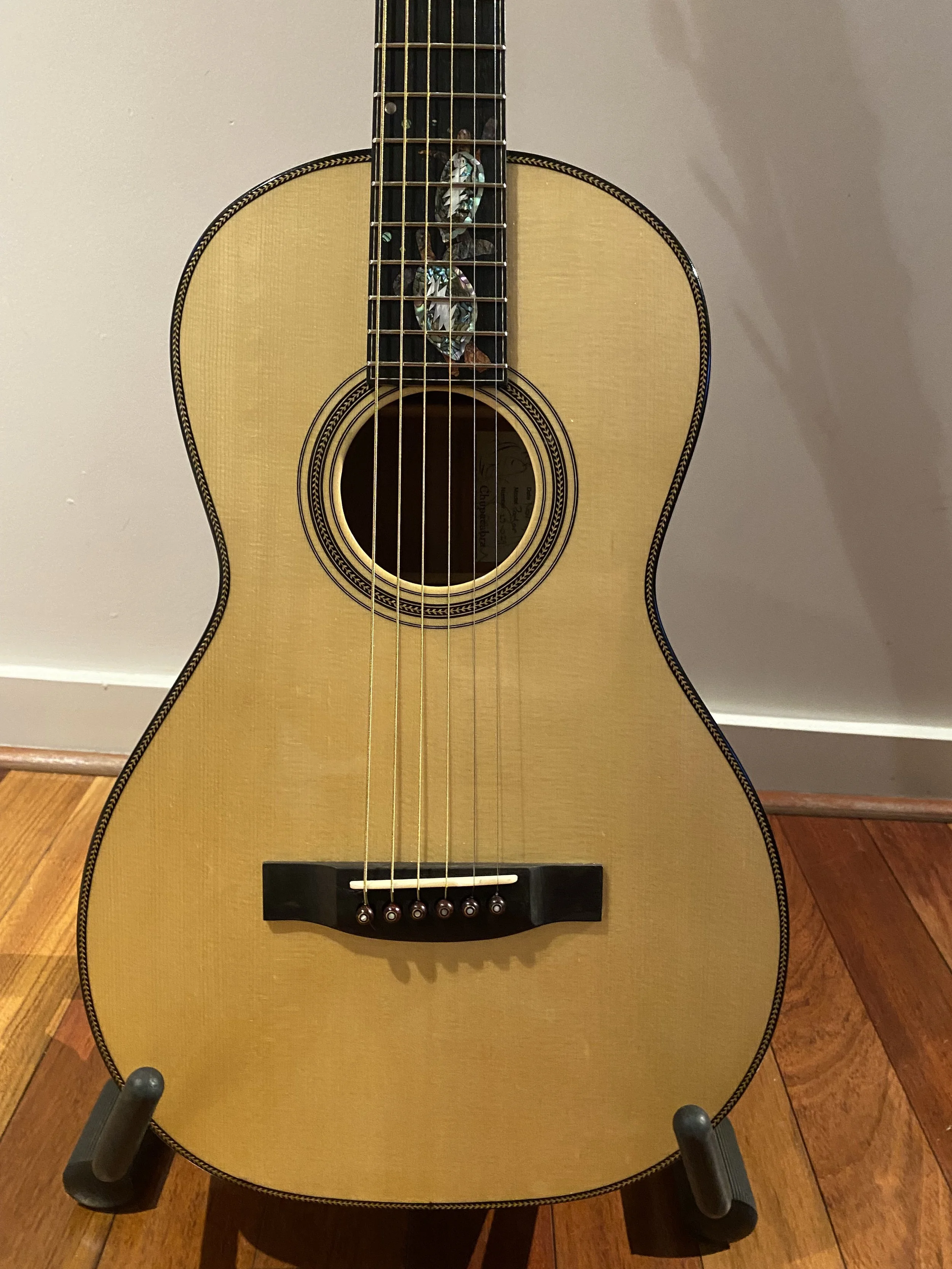 This Parlor is based on a Martin style Size 1 body. It has a 24.5 inch scale with 12 frets clear. Top is Sitka spruce with Honduran mahogany back, sides, and neck. Fingerboard, bridge, bindings and headstock overlay are Gaboon ebony. This instrument has a slotted headstock with a “diamond” volute on the back of the neck, and a traditional dovetail joint. The tuners are Gotoh’s with nickle butterbean knobs, there is also a double action truss rod. Port Orford Cedar was used for the linings and bracing, seventy two individually glued in “tentelones” secure the top to the sides, with hot hide glue used on all acoustically relevent joints. The finish is lacquer.