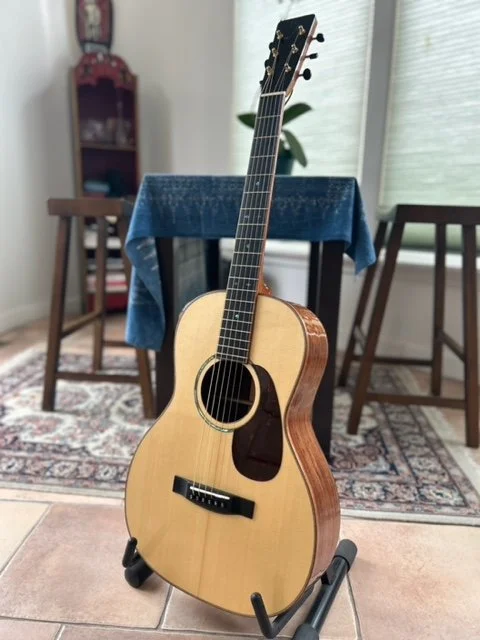 This instrument is a modern take on a traditional pre-war Martin 00-12 fret (“concert”) steel string guitar, with 12 frets clear of the body, a 25.4 inch scale and 1 3/4 inch nut. The top is Englemann spruce with back and sides of Guatamalan rosewood (D. tucarensis). The neck is figured Mahagony, with Gaboon ebony fingerboard, bridge and headstock overlay. The binding on the body and fingerboard are Cocobolo rosewood with a maple purfling strip. The scalloped bracing and linings are salvaged Port Orford Cedar, and the bridge plate is flatsawn hard maple. The top is joined to the rim using individual tentalones. Hot hide glue (HHG) was used throughout. Tuners are open back Schaller Grand Tunes with ebony buttons. Double action truss rod is accessed thru the sound hole. The finish is an epoxy fill, with brushed varnish and padded shellac as the top coat.