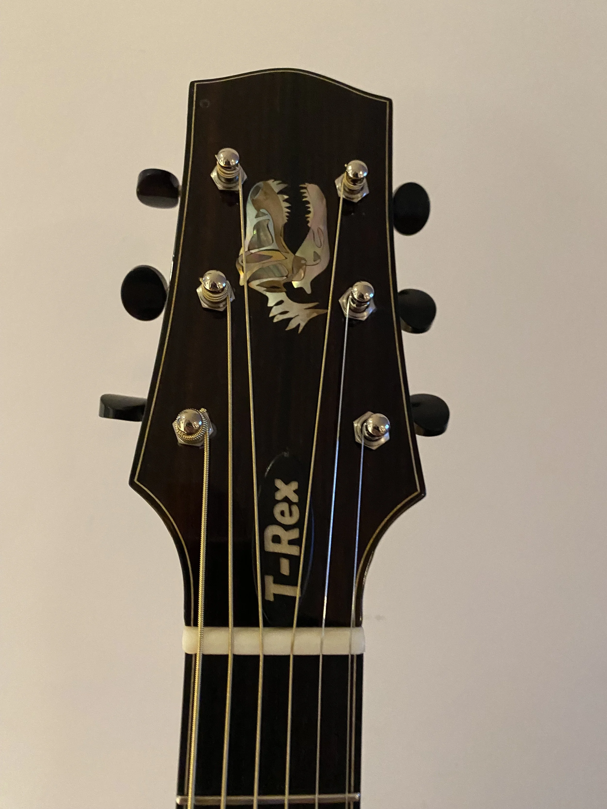 The T-Rex inlay on the headstock and rising sun inlays on the fingerboard were designed and installed by Inlay artist extraordinaire Larry Robinson.